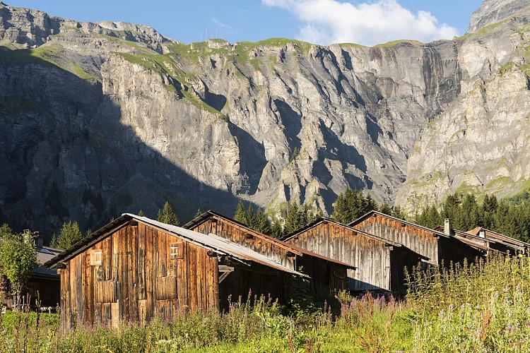 Le chemin surplombe les gorges jusqu’au pont, franchissant le Giffre des Fonts, qui donne accès au refuge et à l’alpage.